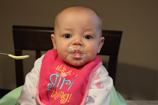 This little girl loves her rice cereal! We tried sweet potatoes the other day and she was gagging the whole time...So we tried them again the next day and she threw it up...Sad! So needless to say we won't be eating sweet potatoes anytime soon...and yes we did get her gagging on video,so I will post it soon.